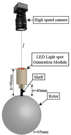 When , i.e., the rotor shaft is perpendicular to the horizontal plane, the distance between the lens of high-speed camera and the midpoint LED is . When varies between 0° and 37.5°, the angle can be computed by