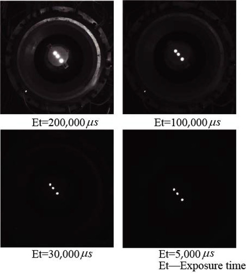 Figure 5 shows the images of three OFPs photographed by the high-speed camera at different exposure times. It can be seen that, when the exposure time of the high-speed camera was 5000 μs, only three OFPs in the image could be identified, which brought great convenience to the subsequent image processing and could be used to extract the coordinates from the three light spots in the ICF.