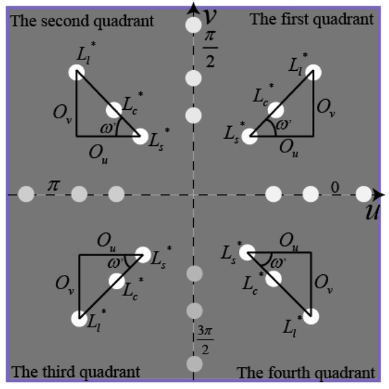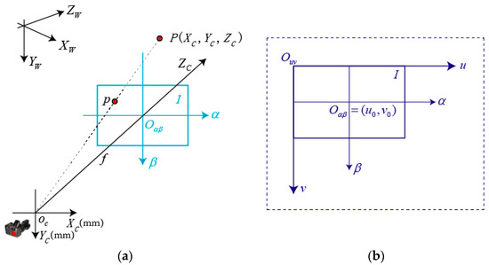 In Figure 6, the point represents the optical center of the camera, and , , , and form the camera coordinate system (CCF). The ICF includes an imaging plane , the horizontal ordinates , and , which are parallel and the vertical ordinates and , which are parallel too, and the optical axis of camera , which is vertical to the imaging plane. The intersection of the optical axis and the imaging plane is the origin of the ICF, which is expressed as . The distance between and is , which is the focal length of the camera. A point in the imaging plane can be expressed as: