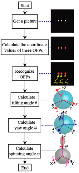 The rotor position in a PMSM can be represented by three rotation angles: The tilting angle_, the yaw angle_, and the spinning angle_. Three rotation angels can be calculated by computing the coordinate values of three OFPs in the ICF, which are captured by a high-speed camera. Figure 8 shows the procedure to calculate the three rotation angles.