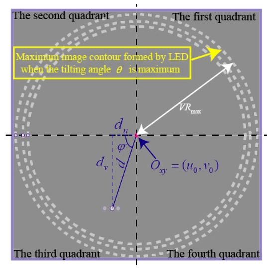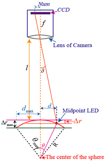 When the tilting angle of the rotor shaft is , Figure 9 shows the relationship between the camera and the midpoint LED, where R is the distance between the sphere center and the midpoint LED.