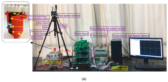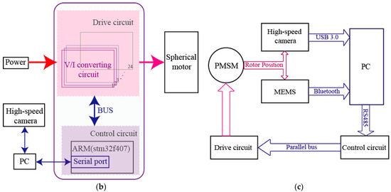 According to the proposed method, the tilting angle_, the yaw angle_, and the spinning angle_ can be calculated to determine a rotor position of the PMSMs. In order to verify the RPM method for PMSMs, an experimental platform, as shown in Figure 13a, was constructed, which consisted of a PMSM and its control circuit, a LSGM and its driver circuit, a high-speed camera (Revealer, Hefei, Anhui, China) and tripod, a power supply (Tradex, Beijing, China), and a computer (Lenovo, Beijing, China). Figure 13b shows the block diagram of the control system. The block diagram of the rotor position measurement system is shown in Figure 13c.