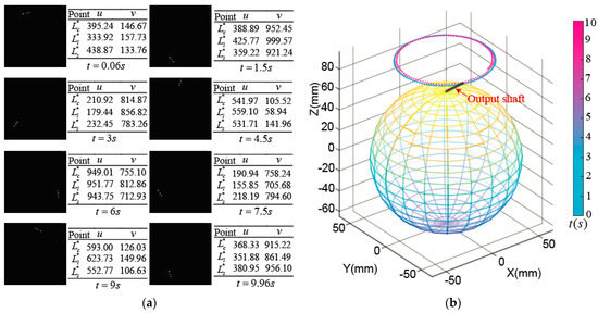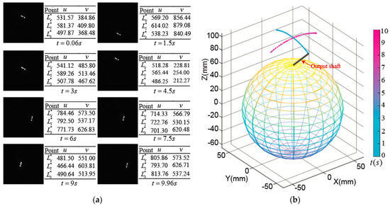Figure 15a shows the images obtained by the high-speed camera when the rotor made a tilting motion; the coordinate values of three OFPs in the ICF were calculated by image processing. Further, we get the position of rotor output shaft tip by the tilting angle_ through Equation (11) and the yaw angle_ through Equation (13), which is shown in Figure 15b.