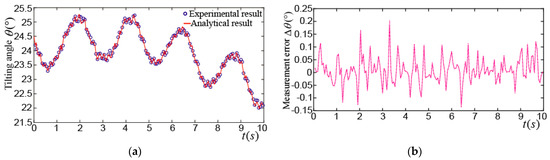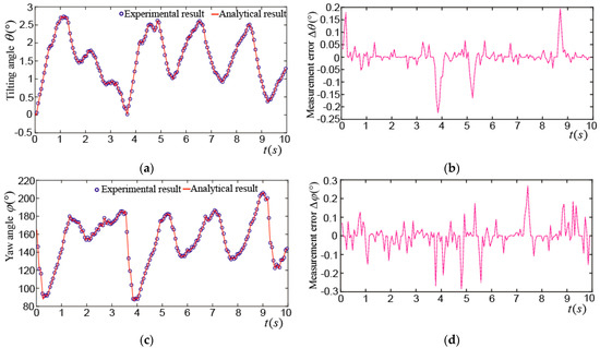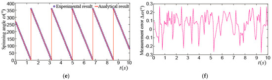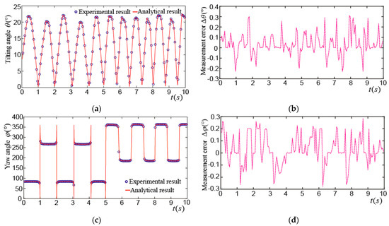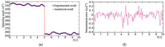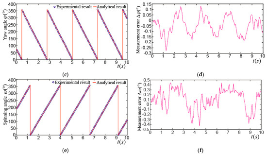 Figure 16a shows the tilting angle_ when the PMSM made a tilting motion. The maximum tilting angle was about 22°, and the rotor wiggled 11.5 times in 10 s. The maximum difference between the experimental and analytical results of the tilting angle was about 0.32°, as shown in Figure 16b. Figure 16c shows the yaw angle_. It moved between 90° and 270° in the first 5 s, which means the rotor made a tilting motion about 5 times near the XZ plane. In the next 5 s, the rotor made a tilting motion about 6.5 times near the YZ plane and the yaw angle moved between 180° and 360°. The maximum difference between the experimental and analytical results of the yaw angle was about 0.3°, as shown in Figure 16d. Figure 16e shows the spinning angle_. It was about 330° in the first 5 s and was changed into about 255° in the next 5 s. The maximum difference between the experimental and analytical results of the spinning angle was about 0.31°, as shown in Figure 16f.