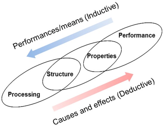 Many engineering systems often appear with glaring features such as being hierarchical, heterogeneous, and having high-dimensionality. In addition, computationally expensive analysis/simulations make it more difficult to identify system-wide design solutions for problems. For example, a complex design problem may be decomposed into several sub-problems, each of which may have independent/dependent design variables with different goals such as disciplines and scales, among others. Typical routines of materials selection strategies are no longer conducive to ensuring system requirements while designing such complex design problems. Therefore, the nature of complex systems have necessitated the inductive multiscale design of materials and products. Olson’s hierarchical concept [] distinguished inductive and deductive decision paths in materials design. As shown in Figure 1, the deductive path corresponds to bottom–up mappings from the processing level to the performance level, whereas the inductive path is the performances-means (top–down) approach to tailor the materials structure or processing parameters to satisfy multiple performance requirements. However, there are numerous challenges due in large part to the presence of uncertainties associated with material models, design variables, and propagation across the design hierarchy. Therefore, robust designs should be considered rather than a single optimal solution to support decision-making, considering performance variation.