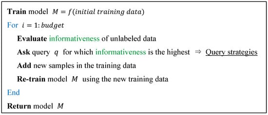 Figure 2 shows the general steps in active learning algorithms. The model for a certain task is first trained based on initially labeled data. The model has access to a pool of unlabeled data and can evaluate their informativeness. Given this informativeness, we ask the next query for which informativeness is highest. In other words, the most informative unlabeled data is selected as the new training data. There are several algorithms for determining which data should be labeled, i.e., query strategies, such as uncertainty sampling, query by committee, expected model change, expected error reduction, among others []. The selected unlabeled data is then labeled and added in the next training data set. Finally, the current model is retrained using the new training data. The steps within the for-loop are repeated until the allowable budget is reached.