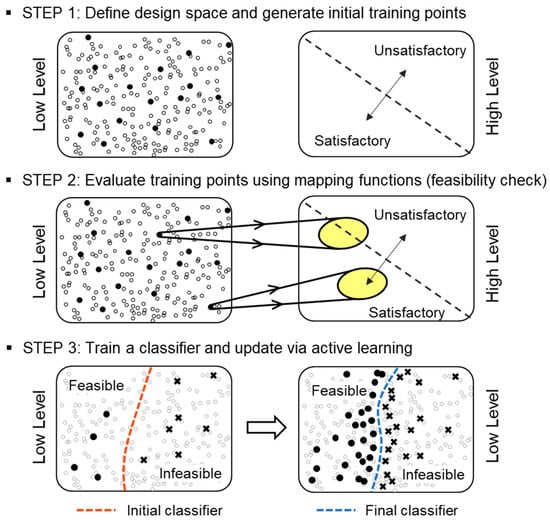 The abovementioned active learning process is applied to traditional IDEM. The graphical procedure of the proposed method is shown in Figure 3. First, the design spaces at each level are defined, and they generate a large pool of unlabeled data. Among the unlabeled data, the initial training points to be evaluated are randomly chosen. Step 1 involves the same preparation procedure for active learning contexts. In Step 2, the initial points are evaluated using the employed mapping models to label them as feasible or infeasible. The feasibility check is performed in the same manner as traditional IDEM (same as Step 2 and 3 in Section 2.1) by calculating HD-EMIs.