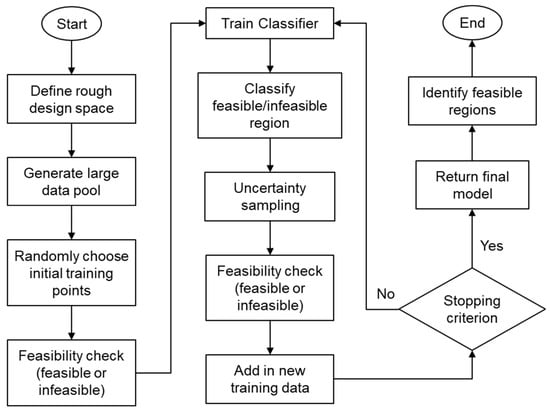 The next step is to train a model with previously evaluated feasible/infeasible points and iteratively update the model in an active learning manner. Here, our model (M) is a classification model to represent the feasible/infeasible region in design spaces. In traditional IDEM, feasible and infeasible regions are only a group of feasible and infeasible points, respectively, and this representation is directly influenced by the initially sampled grid points at each design level. That is, a large sample size is required for the high resolution of feasible/infeasible regions, which in turn increases computational expense. Therefore, the classification algorithm is employed to avoid excessive grid points evaluations. In this study, a support vector machine (SVM) is used to classify regions as feasible or infeasible for the given feasible/infeasible samples. SVMs are one of the most common and powerful classifiers and were observed to be highly suitable for the active learning setup [,,,]. When the first SVM is used to classify feasible/infeasible regions, the initial feasible regions identified by the SVM are not expected to be accurate enough, as the number of initial training points is relatively small. Therefore, the current classifier requires more samples to update and additional sampling can be implemented through query strategies. Among the strategies, uncertainty sampling is the simplest and most commonly used query strategy that an active learner queries the instances about, which it is least certain how to label []. Here, the most uncertain points to be classified as feasible or infeasible are obviously the points closest to the decision boundary of the SVM. Maximum uncertainty implies that the current SVM has the least confidence on its classification. The feasibility check is performed on the chosen points through uncertainty sampling. The newly identified feasible and infeasible points are added to the initial training points and the augmented training points are used to retrain the SVM. This closed-loop of query and retraining is performed until the allowable budget is reached or the stopping criterion is met. Finally, the final SVM classifier is used to identify feasible regions. Steps 1–3 are repeatedly performed to sequentially search the feasible solution regions at lower levels. The detailed tasks of the method are also shown in Figure 4.