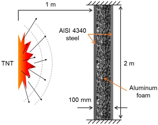 For demonstration, we designed a sandwich panel with an aluminum foam core for blast resistance applications, as illustrated in Figure 5. Aluminum foam is a useful material that is capable of absorbing blast energy or projectile impacts because of its high specific strength, low relative density, and high energy-absorbing capacity [,,,]. Given the excellent material properties, aluminum foam-cored sandwich panels (AFSPs) can be widely applied as energy absorbers in a wide range of impact- or blast-protection applications, such as crash barriers, blast mitigators, and munitions packaging. In this study, we designed a circular AFSP (2 m diameter, 100 mm fixed total thickness) capable of satisfying the performance requirements for deflection and structural mass subjected to a blast impact of 15 kg of TNT at a distance of 1 m (Figure 5).