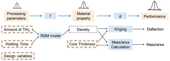 The hierarchical design flow of the sandwich panel is shown in Figure 6. The sandwich panel problem can be decoupled into three levels: Processing level, property level, and performance level. The variables designed here were the processing parameters for the aluminum foam that affect the structural/mechanical properties of the core as well as the foam core thickness (Tc). With the given sandwich panel geometry and material properties, the final performances were maximum deflection due to blast impact and mass/area of the panel. A response surface model links the processing and property levels and is established to represent the influence of two processing parameters (amount of TiH2 and holding time) on the relative density of the aluminum foam []. The deflection and mass/area as functions of core density and thickness were calculated by a kriging model and mass/area equation, respectively. Additional information on the models that linked the design levels as well as model validations are discussed in detail in our previous study []. The performance requirements were established as a maximum deflection of ≤80 mm and mass/area value of ≤20 g/cm2.