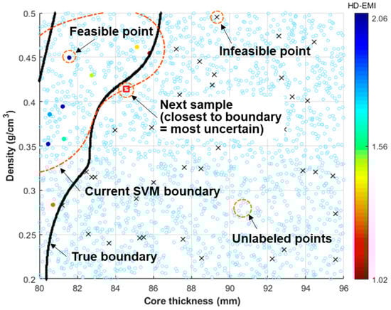 Step 3: Trained a classifier and updated it via active learning algorithm, as illustrated in Figure 7. First, an SVM was trained with the initial training data. The SVM is capable of nonlinear classification using kernel trick and the radial basis function kernel was used in this study []. The first trained SVM identified feasible/infeasible regions, and the group of boundary points as a decision boundary were drawn in a dashed red line. The true boundary obtained in the previous study is also shown in black line for comparison. To further update the SVM, new unlabeled samples m = 1 ( in Figure 7, shown in red square) that were closest to the boundary were chosen based on the uncertainty sampling. This implies that the points closest to the boundary will be the most informative samples to improve the classification boundary. Then, the samples were evaluated again and determined as feasible or infeasible points. Now, the SVM was retrained using 50 + m samples. The uncertainty sampling and retraining were repeated until the allowable budget was reached. For example, Figure 8 shows the results when 100 iterations were allowed for active learning of the SVM. As shown in the figure, the SVM decision boundary gradually improved and became similar to the true boundary, which indicates that the accuracy of the feasible region is improved by active learning.