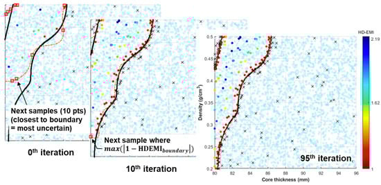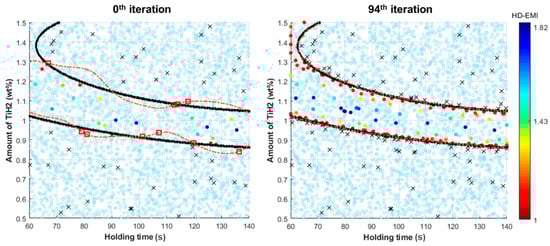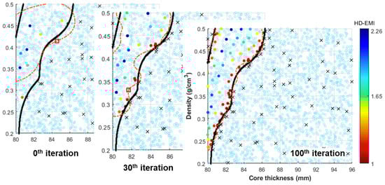 The example shown in Figure 8 was given 100 budget iterations; however, this budget may be ambiguous in practical situations. It is also observed that the decision boundary of the SVM after 100 iterations needs to be improved further. To further improve our algorithm, the stopping criteria for the SVM active learning algorithm were established. Unlike the budget-based loop learning in the general active learning manner shown in Figure 2, two closed loops were performed with each stopping criterion in the modified algorithm. Since the true boundary is a group of points whose values of HD-EMIs are exactly unity, the stopping criteria were defined based on the HD-EMIs of decision boundary points. While increasing training points by uncertainty sampling, the first loop stopped when the mean HD-EMIs of the current SVM boundary points ≈1. This was to aggressively update the general decision boundary of the SVM in the first loop. After the first loop is complete, there may be small areas that still do not coincide with the true boundary. In the second loop, a boundary point whose value of HD-EMI farthest to unity among the current SVM boundary points, i.e., , was chosen as next sample to be evaluated. This corresponds to choosing a boundary point farthest to the true boundary. In this manner, the SVM boundary is consecutively corrected where the inconsistency between the current SVM and the true boundary is greatest. Then, the second loop ended when the standard deviation of the current SVM boundary points ≈0. Therefore, the goal of the double-loop learning is to train the SVM whose decision boundary turns into the true boundary in two sequential loops.