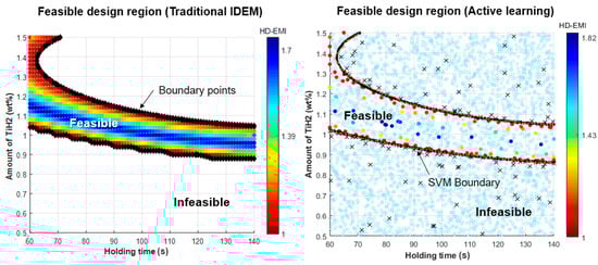 Feasible region obtained by traditional IDEM (left) and active learning (right) at processing level.