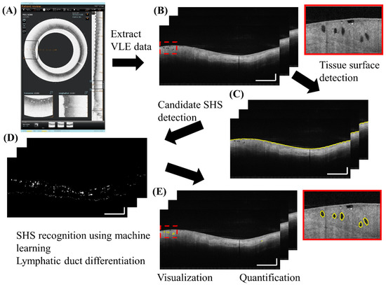 Swager et al. [11] reported that most of the SHSs in VLE are normal histological features. In this study, we applied a criterion to differentiate normal lymphatic ducts from glands based on their longitudinal axis length. Although empirical, this was effective in excluding most of the normal lymphatic ducts from glands from unwanted analysis. However, it may be difficult to differentiate between glands and vessels in VLE due to their similar intensity. Newly developed functional imaging methods such as OCT angiography can be applied to identify depth-resolved vasculature [27,28]. Moreover, we could not exclude the possibility that there might be other normal features that were detected as “gland-like” structures by the algorithm. Nevertheless, the algorithm can be used with laser marking technology [29,30] to further validate the nature of SHSs found in VLE with histopathology of co-registered excisional biopsies.