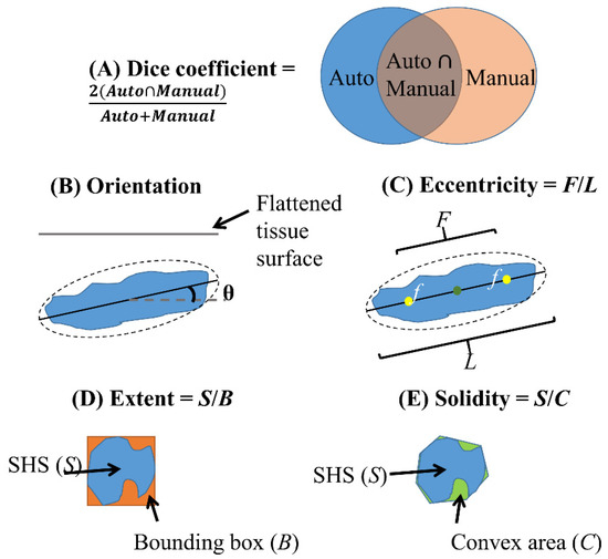 Illustration of Dice coefficient (A) for validation of SHS boundary segmentation and quantitative shape descriptors (B–E) used in this study. (B) Orientation is the angle between the flattened tissue surface and the major axis of the ellipse fit to the SHS. (C) Eccentricity is the ratio of the distance between the foci (f) of the ellipse and its major axis length. (D) Extent is the ratio of area between the SHS and its bounding box. (E) Solidity is the ratio of area between the SHS and its convex hull.