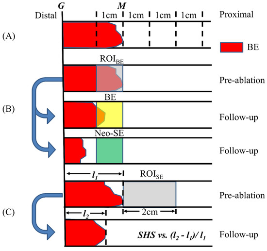 Illustration of the three SHS analysis studies. (A) The 4 cm segment starting from the 1 cm Barrett’s esophagus (BE) region distal to M was divided into 1 cm segments to study the general distribution of SHSs. (B) The SHSs in the BE region 1 cm segment distal to M were analyzed and metrics were compared to post-ablation response. (C) The SHSs in the squamous region were analyzed and metrics were correlated with the relative change of BE length after ablation.