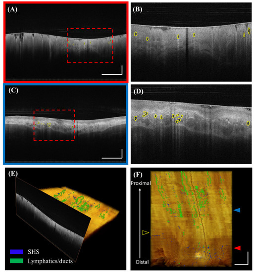 Visualization of automatically detected SHSs. (A) Volumetric laser endomicroscopy (VLE) image with automatically detected SHSs under the BE region in polar coordinates. (B) Corresponding zoomed-in view. (C) Automatically detected SHSs under the squamous region. (D) Corresponding zoomed-in view. (E) and (F) 3D visualization of SHSs (blue) and lymphatics/ducts (green). The registration line on the balloon is also visible as a dark band traversing the entire pullback. The red and blue solid arrows indicate the cross-sectional position of (A) and (C), respectively. The yellow hollow arrow indicates the maximum extent of BE. Scale bars: 1 mm.