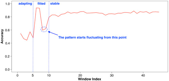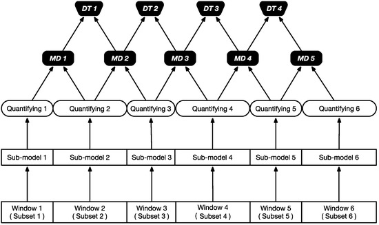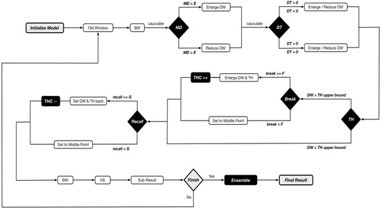 | Initial the model While (until reach the end of the data set) DW moves forward by the step of the current WW BW updates the model based on the current window Quantifying the current model Calculating Adjusting Window Width based on if MD in (0, 0.1) then WW = WW MD vector [0] else if MD in (0.1, 0.2) then WW = WW MD vector [1] else if MD in (0.2, 0.3) then WW = WW MD vector [2] …… else MD in (1, ∞) then WW = WW MD vector [10] end if Calculating Adjusting Window Width based on DT: if DT in (0, 0.1) then WW = WW DT vector_en [0] else if DT in (0.1, 0.2) then WW = WW DT vector_en [1] else if DT in (0.2, 0.3) then WW = WW DT vector_en [2] …… else DT in (1, ∞) then WW = WW DT vector_en [10] end if if DT in (−0.1, 0) then WW = WW DT vector_rd [0] else if DT in (−0.2, −0.1) then WW = WW DT vector_ rd [1] else if DT in (−0.3, 0.2) then WW = WW DT vector_ rd [2] …… else DT in (−∞, −1) then WW = WW DT vector_ rd [10] end if Adjusting WW & TH: if TH break > F + THC then new WW = {current upper bound + average [sum (intended WWs in recent F times)]}/2 new TH upper bound = {current upper bound + average [sum (intended WWs in recent F times)]/2} new TH lower bound = current lower bound + increased section of upper bound THC ++ else then new WW = (current lower bound + current upper bound)/2 end if if TH recall > G then new WW = {current lower bound − average [sum (intended WWs in recent G times)]/2} new lower bound = {current lower bound − average [sum (intended WWs in recent G times)]}/2 new upper bound = current upper bound − decreased section of lower bound THC -- else then new WW = (current lower bound + current upper bound)/2 end if BW updates the model based on the current window Quantifying the current model Calculating FW predicts the samples in DW → sub-result: End while Ensemble → majority voting among → ensemble results X |