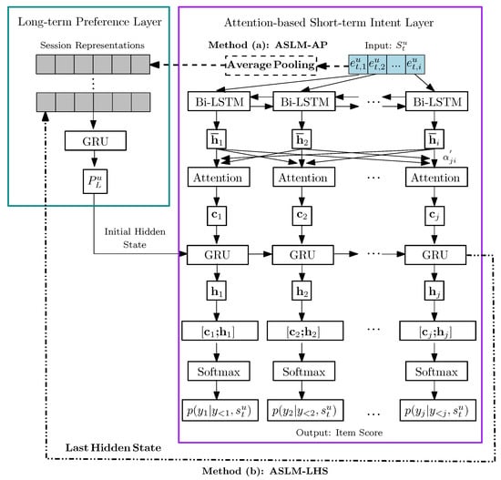 - enhance the recommendations by employing an augmented attention-based encoder-decoder in a structured framework named Attention-based Short-term Intent Layer. We use the encoder to process the events within a session, i.e., a user’s short-term intent, and make the decoder receive the user’s long-term preference representation from the user’s history session representations as its initial hidden state. As a result, the model enables the Attention-based Short-term Intent Layer to combine both the user’s long-term preference and short-term intent in the attention process. Eventually, for ASLM-LHS, the decoder stores its output state in session representations for the Long-term Preference Layer to update the states for future recommendation. For ASLM-AP, we put the average of current session’s embedded vector representations of the items into session representations.