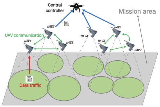 In the above scenarios, UAVs arrive at the designated position according to task demand and perform coverage tasks such as data collection. Next, the information (data, etc.) will be forwarded to the central UAV through the UAV-to-UAV link. Note that UAVs can carry limited energy, and the energy consumed by information transmission must be minimized based on mission requirements. Therefore, the data transmission mechanism should be well constructed in UAV communication. In general terms, as the transmitting distance grows, the energy consumption of UAVs will increase exponentially. To avoid high energy consumption, an effective technical solution is proposed in [], utilizing some UAVs as relays. However, it remains challenging to deploy UAVs and design transmission mechanism due to the complex cooperative behaviors among UAVs.
