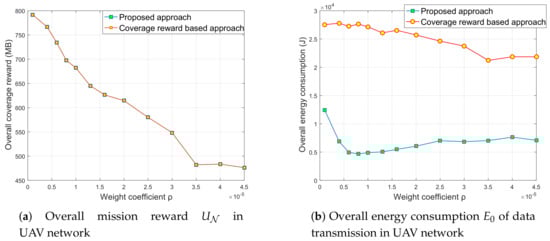 Figure 3a,b demonstrates the comparison results. In Figure 3a, as the weight coefficient scales up in the beginning, the overall coverage reward of the proposed approach decreases due to the increased importance of energy consumption. Meanwhile, the overall reward of comparison approach tends to be the same as , as can be expected. In particular, in the late stage (), UAVs are no longer keen to cover high-yielding areas since the importance of energy consumption is extremely high, which makes UAVs form a stable deployment state.