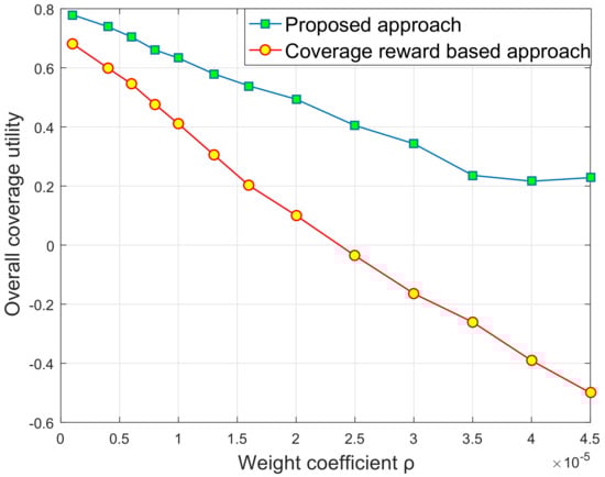 According to the above results and Equation (6), the comparison of coverage utility is shown in Figure 4, which is an important indicator of the whole UAV network. This figure shows that coverage utility under all approaches decreases as the weighting coefficient increases in the beginning, while the proposed approach can achieve higher coverage utility under the same weight coefficient. This suggests that, without a guarantee of coalition formation mechanism, the system will obtain a fair reward, but, at the same time, needs more energy consumption, so that the coverage utility is less. Likewise, in the late stage (), the coverage utility of the proposed approach tends to be stable since the coverage reward and energy consumption is in a stable state.
