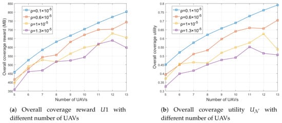 Figure 5a,b shows changes in overall coverage reward and overall coverage utility for different numbers of UAVs, respectively. From the figure, we observe that the coverage performance improves as the number of UAVs increases, which are consistent with the fact that more UAVs are able to collect more data information from the ground. However, when the number of UAVs reaches a certain number, the increase in coverage utility will slow down until eventually declining. The main reason says that there is an upper bound for coverage reward due to the limited data information. Meanwhile, in the coalition structure, more UAVs mean more transmission paths, and the high-energy consumption of the increasing transmission paths will make it worthless. Note that the model with the increase of weighting coefficients will also make the model focus more on energy consumption, so coverage utility will decrease with the increase of the weighting coefficient, even reaching the “saturated” state in advance (e.g., eleven UAVs with and twelve UAVs with ). Therefore, the performance shows such a fluctuant shape.