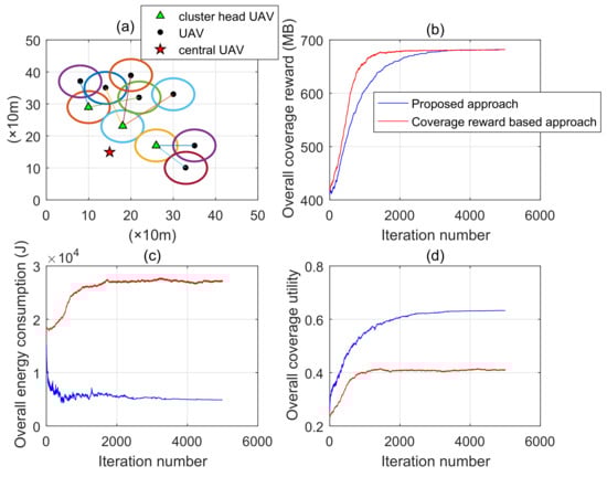 In order to deeply investigate convergence performance, we choose as a contrastive index of both approaches. Figure 6a shows the diagram which shows the diagram of the convergence state of UAV deployment and coalition formation. Convergence performance of different algorithms is shown in Figure 6b–d. We observe that all the indicators converge after a certain number of iterations, which indicates that our proposed method can achieve a stable state solution of the system model. The coverage reward of the comparison algorithm converges to the same value. However, since there is no coalition formation mechanism for a comparison approach, its energy consumption and coverage utility converge to a worse level, which is consistent with the model analysis. It is an issue when facing complex environment, such as disaster, which requires UAVs to make accurate and fast self-decision for rapidly changing scenario parameters. Authors in [] utilized reinforcement learning (RL) to solve the problem of anti-jamming communications in dynamic jamming environment. The application of RL can significantly help UAVs adapting to dynamic environment and make deployment and parameters adjustment accordingly. This gives us inspiration and will be our next step of the work outlook.
