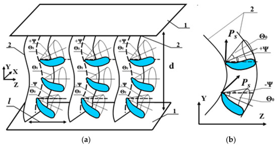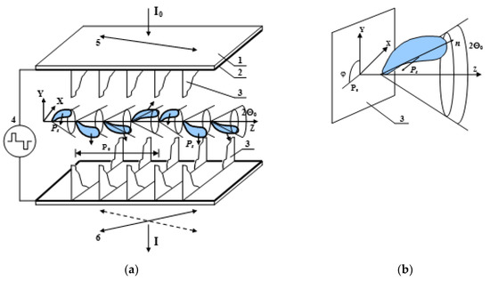 Reorientation of the FLC director due to the interaction of the alternating electric field E applied along the coordinate y (Figure 2b) with the spontaneous polarization PS can occur both by changing the azimuth angle φ of the director orientation by 180° (if the director is reoriented along the generating lines of a cone with \ apex angle 2Θ0) and by changing the distribution of ψ (deformation of smectic layers). In the first case, the dissipative coefficient is the rotational viscosity γϕ, and in the second one, the viscosity γψ of the shear deformation predominates [16,18].