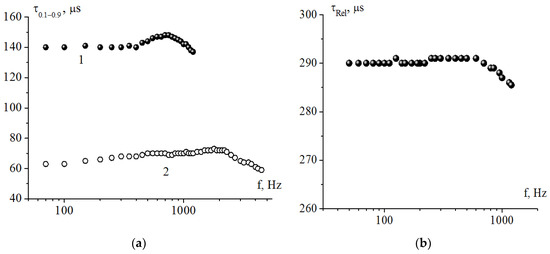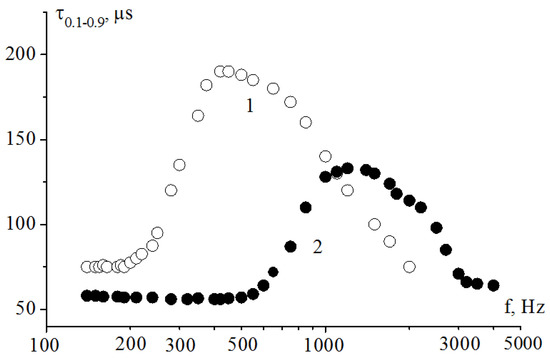Frequency dependencies of the electro-optical response time for the HF32D composition (γφ = 0.15 Poise). 1—amplitude of the bipolar voltage (meander) ±1.5 V; 2—amplitude ±9 V. The thickness of the electro-optical cell is 1.7 μm.
