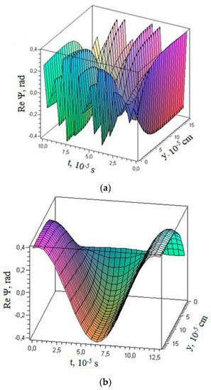 Since ψ in a general case can depend not only on the coordinates but also on the time, we have ψ = ψ (y′,t′) = ψ0 exp (−iξt′), where ξ > 0 is a constant, and ψ0 is the amplitude, which is a slow function of time [24]. Thus, Equation (8) is converted to the following:
