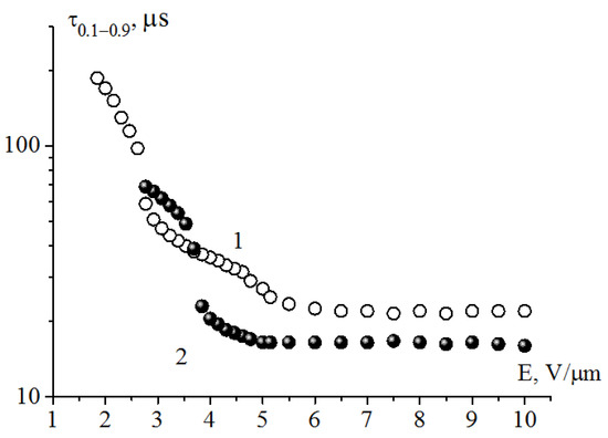 The transition to the soliton mode can occur not only with increasing frequency of the electric field change, but also with increasing field strength at fixed frequency. This transition is accompanied by a sharp decrease in the optical response time when a certain threshold value of the field strength is reached (Figure 9). With increasing frequency, the threshold value of the field for the transition to the soliton mode decreases, and the time of the optical response τ0.1–0.9 decreases (Figure 9, curve 2) at a lower frequency.
