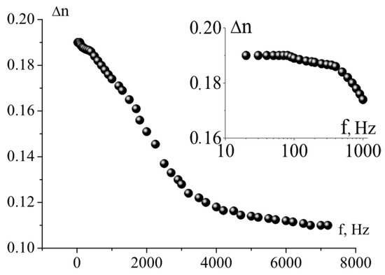 Frequency dependence of the birefringence of the HF-32C composition. Inset: a low-frequency part of this dependence. The thickness of the electro-optical cell is 1.7 μm. The amplitude of the bipolar control voltage (meander) is ±1.5 V.