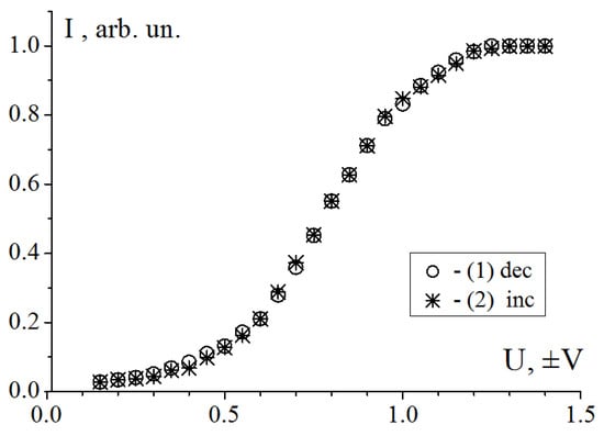 Dependence of the light transmission on the electrical voltage for the frequency 6 kHz at decreasing (1) and increasing (2) voltage. The thickness of the electro-optical cell with the HF-32C composition is 1.7 μm.