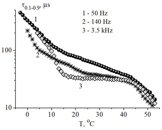 It is important that the predominance of shear viscosity in a soliton mode results in weakening the temperature dependence of the electro-optical response time in a wide temperature interval (Figure 12). The higher the frequency of light modulation (and the frequency of the control voltage), the wider the temperature interval in which the time τ0.1–0.9 is almost constant. It shifts to both high and low temperatures, and for the HF-32C composition, the time τ0.1–0.9 at the maximum possible light modulation frequency of 7 kHz is from 10 to 52 °C.
