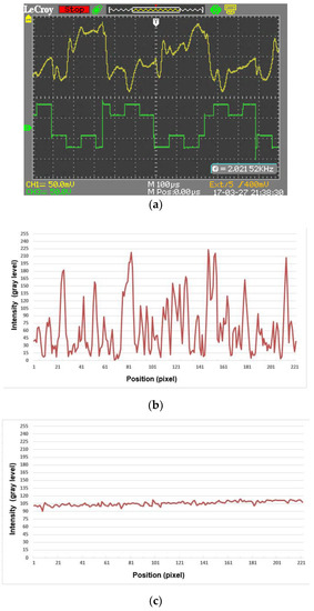 Illustration of the operation of an experimental sample of a despeckler using the novel helix-free FLC: (a) Oscillograms of the control voltage (zero level—digit 3) and phase delay modulation (zero level—digit 1); value of a low-frequency signal (meander) 2 kHz and amplitude ±50 V; frequency of the modulating signal is 7 kHz and amplitude ±15 V; electric field strength is 3.25 V/μm; (b) Radiation intensity distribution in the cross section of a laser beam transmitted through the electro-optical despeckler sample when the control voltage is zero; contrast of the speckle pattern C0 = 0.82; (c) Radiation intensity distribution in the cross section of a laser beam in the presence of the control voltage; contrast of the speckle pattern C1 = 0.07. The thickness of the FLC cell is 20 μm. The wavelength of the laser radiation is 0.65 μm.