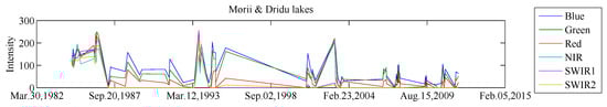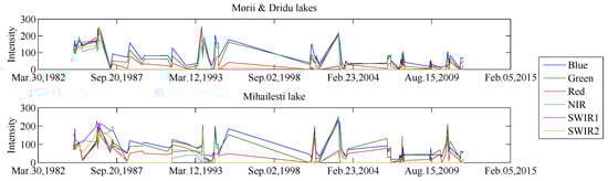 In the first setup, we aimed to discover two types of spatio-temporal evolution related to the formation of three accumulation lakes in the Bucharest region, namely Morii, Dridu and Mihailesti. If compared to the Morii and Dridu lakes, Lake Mihailesti has a distinct spatio-temporal evolution because this accumulation lake was emptied several times (in 1987 and in 1992) during its construction. The spectro-temporal differences between the two queries can also be observed from the spectro-temporal signatures shown in Figure 7. In this sense, the user performs two independent queries, each selected from the regions of interest. The analyzed period of time was between 1984 and 1993 and the dataset considered for retrieval was the short Landsat SITS composed of 10 images captured in the mentioned period (i.e., one image per year).
