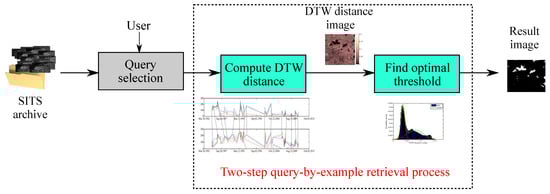 In this paper, we described an effective query-by-example retrieval system that can be used for the exploitation of Earth Observation SITS. The strategy is based on a two-step procedure. The first step consists of measuring the degree of similarity between a query provided by the user and other spatio-temporal evolutions in SITS. The second step consists of separating similar and non-similar patterns via an optimal thresholding technique applied over the DTW distance image obtained in the first step.