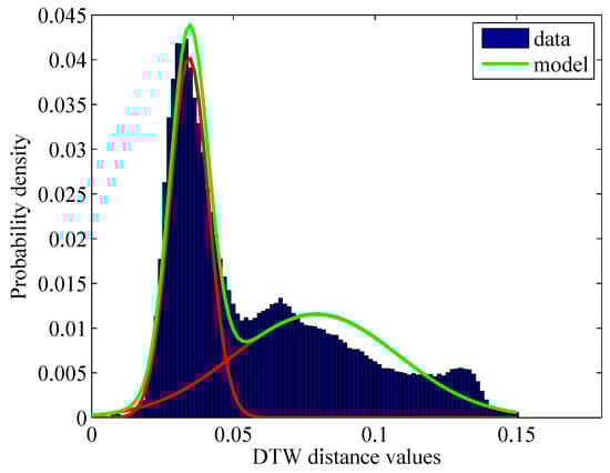 In the following text, we denote the random variable associated to the computed DTW similarity scores by X, whilst x represents a particular DTW score. Following the formalism initially presented in [], let us assume that the scores are drawn from a mixture of two Gaussian distributions, and . The first Gaussian distribution corresponds to evolutions that are similar to the given query, whereas the second component refers to non-similar evolutions.