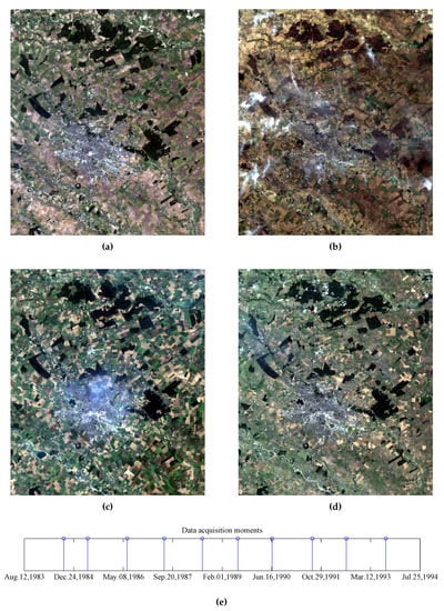 Short Landsat SITS comprised of 10 images captured between 1984–1993. Only four representative images (i.e., containing specific changes) of the series are shown: (a) 1984, (b) 1987, (c) 1988, (d) 1992. The distribution of the acquisition moments is shown in (e).