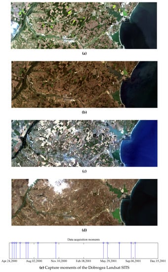 Dobrogea Landsat SITS comprised of 13 images captured between 6 May 2000 and 14 September 2001, in the Dobrogea region. Four images of the series are shown, namely: (a) 6 May 2000, (b) 22 May 2000, (c) 9 July 2000, and (d) 29 October 2000. The distribution of the acquisition moments is shown in (e).
