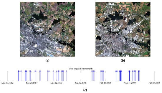 Long Landsat SITS comprised of 88 images captured in 1984–2011. Only the first and the last images of the series are shown, namely (a) 1984 and (b) 2011. The distribution of the acquisition moments is shown in (c).