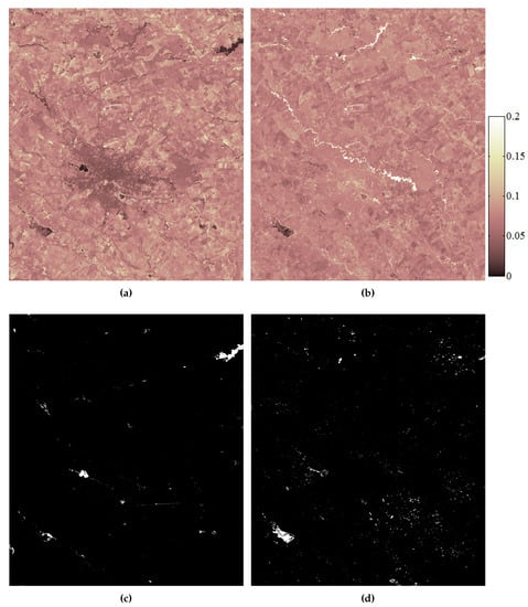 Pattern discovery in short Landsat SITS. (a) DTW distance image for a query marked inside the Morii & Dridu accumulation lakes. (b) DTW distance image for a query marked inside Mihailesti accumulation lake. (c) Pattern discovery using the proposed method for Morii & Dridu accumulation lakes. (d) Pattern discovery using the proposed method for Mihailesti accumulation lake. In the case of DTW distance images presented in (a,b), dark color represents similar evolutions and bright color represents non-similar evolutions, whereas in (c,d), white pixels correspond to spatio-temporal patterns that are similar to the query, which was selected from the region of interest.