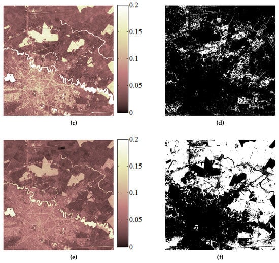 Land use mapping in long Landsat SITS. (a) DTW distance image for a query made in the urban area. (b) Urban area delimitation using the proposed query-by-example retrieval method. (c) DTW distance image for a query made in the extra-urban area. (d) Extra-urban area delimitation using the proposed query-by-example retrieval method. (d) DTW distance image for a query made inside the agricultural area. (e) Agricultural area delimitation using the proposed query-by-example retrieval method. In the case of DTW distance images presented in (a,c,e), dark color represents similar evolutions and bright color represents non-similar evolutions, whereas in (b,d,f), white pixels correspond to spatio-temporal patterns that are similar to the query, which was selected from the region of interest.