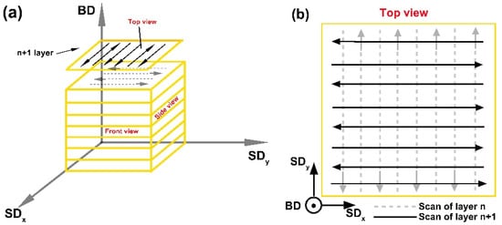 Overview of the AM processing strategy. The build (BD) and scan directions (SDx and SDy) are indicated with respect to the sample coordinates: (a) the different views of the sample; (b) top view of the sample with the bidirectional scan vectors.