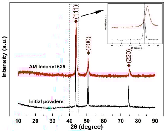 The XRD results of the as-received initial Inconel 625 powders and specimens after AM process are shown in the Figure 3. It can be seen that the AM-sample mainly consists of Ni-base austenite phase (γ phase) with crystal size of ~5.61 μm. Lattice parameter of the as-received powders is 3.5899 Å and decreases after AM process to 3.5716 Å, which can be demonstrated by a right peak shift on the 2θ scale for the AM-Inconel 625 (the inset in the Figure 3). Peak shifts are usually caused by the change of the crystal lattice whereas shifts to higher angles are caused by compression of the crystal lattice. This decrease can be attributed to the depletion of Nb, Cr and Mo in the γ-matrix, since these elements participate in the formation of intermetallic phases []. Additionally, a lattice parameter shift in the AM sample compared to the standard alloys 625 fcc γ-Ni phase also indicates that potentially precipitates in the γ-Ni matrix are formed during the AM process. However, the phases precipitated in γ-Ni matrix are not detected by XRD due to a relatively low volume fraction of these precipitates. The result is similar to the previous studies []. Only three peaks including 111γ, 200γ and 220γ are detected and this reveals the pattern of the columnar dendritic growth [].