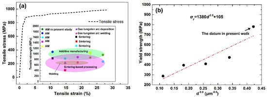 where σ0 is 687.6 MPa, calculated by the linear relation in Figure 4b. Using the results from Equation, σy is 782.2 MPa, which is in good agreement with the experimental result of the yield strength (793 MPa). It is worth noting that the full density (100% relative density) is not achieved during the AM process and the presence of a small amount of porosity in the printed samples is not taken into the consideration in strength calculations. Micro-pores may lead to premature failure through the coalescence of micro-pores and the subsequent propagation of cracks, especially for tensile tests.