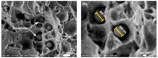 The corresponding fractography of AM-Inconel 625 tested at room temperature is shown in Figure 5. Dimples and particle facets of precipitates are clearly found in the fracture surface, while no obviously microcrack can be observed. This suggests that the failure of AM-Inconel 625 shows a ductile character. A high magnification of the fracture surface (Figure 5b) shows spherical precipitates with a size around 600 nm. In the case of precipitate strengthening (Δσp), the dislocation shearing or the Orowan dislocation bypass is believed to be the main strengthening mechanism. For the shearing mechanism, the improvement of the yield strength can be ascribed to contributions of coherency strengthening (Δσcs), modulus mismatch strengthening (Δσms) and order strengthening (Δσos) []. The shearing mechanism is more significant for coherent precipitates with small radii and the transition to Orowan bypass mechanism is active when the radii of coherent precipitates reach a critical value or when the precipitate is separate [], as can be seen in this work (Figure 5b).