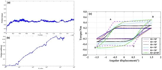 The typical friction torque versus angular displacement amplitude curves (T-θ curves) at the fretting cycles of 100, 101, 102, 103, 104 and 2 × 104 are displayed in Figure 6c to evaluate the fretting running state. For the T-θ curve with a parallelogram shape, the segments and correspond to the sliding of the two contact surfaces and the tilt segments and correspond to the static friction force. All the T-θ curves show the shape of quasi-parallelograms, undoubtedly indicating the gross slip between the contact interfaces during the fretting wear process. For an individual loop, the tangential force is almost constant and without tips at the end, indicating that adhesion wear is mild between the contact surfaces.