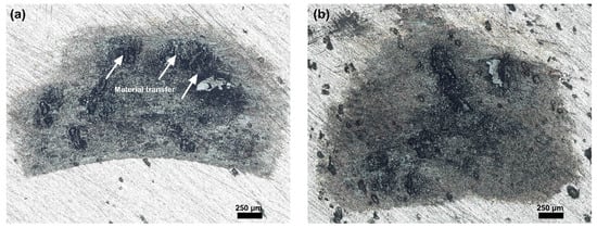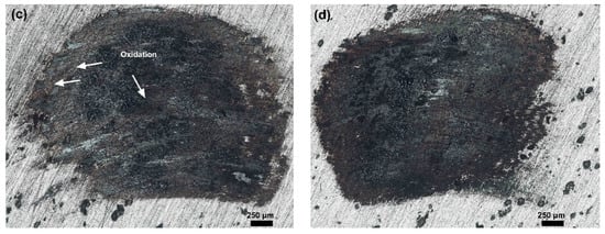 To explore the wear mechanism of AM-processed Inconel 625 alloy, optical images of the fretting wear tracks from tests at 40–106 N loads are shown in Figure 7. Figure 7a represents the measurements obtained from the test of AM-processed Inconel 625 at a contact load of 40 N, showing the material transfer from the counterpart. The optical image of the fretting wear track after test at 62 and 84 N are shown in Figure 7b,c, respectively. Similarly, material transfer can be observed on both wear tracks and apparent surface oxidation occurred at a contact load of 84 N. It has been confirmed that fretting wear decreased substantially for most friction couples (metals) as the relative humidity increases from zero to fifty percent []. In this study, with humidity about 60%, moisture promotes the formation of soft iron hydrates such as abrasive Fe3O4, magnetite and a magnetic oxide of iron. Figure 7d shows the wear track obtained after test at a contact load of 106 N. Severe oxidation on the surface could be observed. All the tests at different contact loads last for 2 × 104 cycles without experiencing a significant amount of surface damage, indicating superior wear-resistance of AM-processed Inconel 625.
